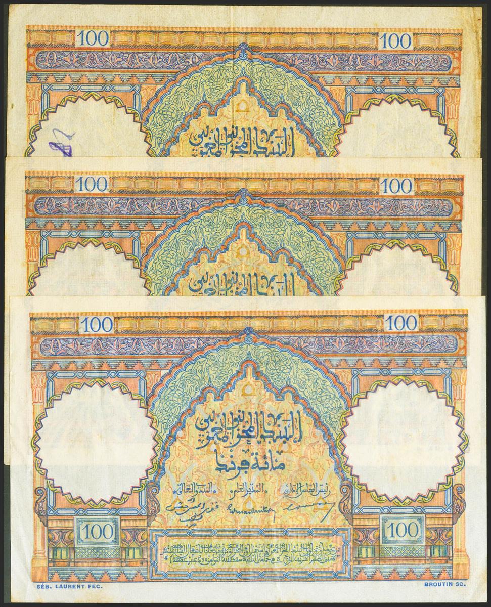 MOROCCO. Set of 3 banknotes, 100 Francs. (1948ca). (Pick: 45). TO EXAM.
