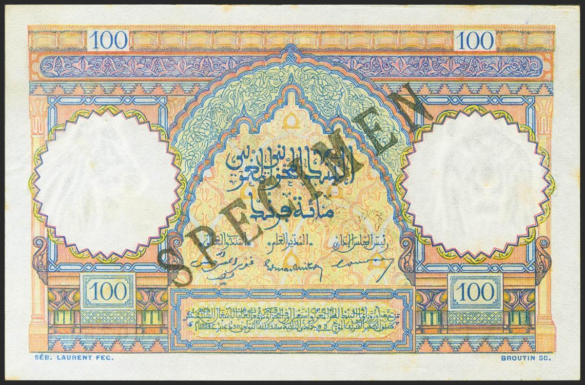MOROCCO. 100 Francs. 10 November 1948. SPECIMEN and numbering 00000000. (Pick: 45s). Spots rust. About Uncirculated+.