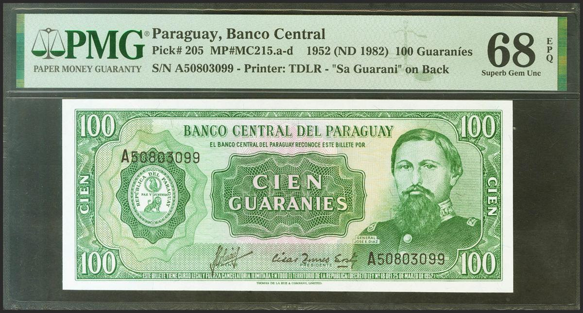 PARAGUAY. 100 Guaraníes. 1952. (Pick: 205). PMG68EPQ.