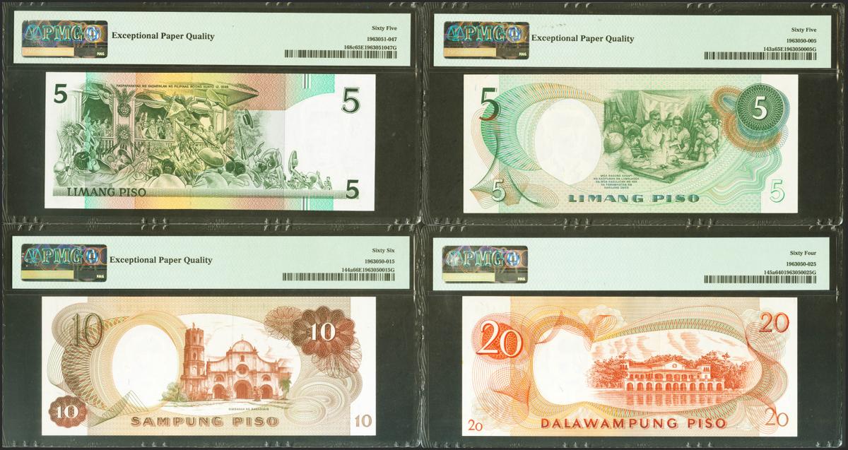Set of 4 Philippines banknotes of 5 Piso (2), 10 Piso and 20 Piso, issued in 1949. (Pick: 143a, 144a, 145a, 168c). PMG65EPQ, 66EPQ, 65EPQ, 64.