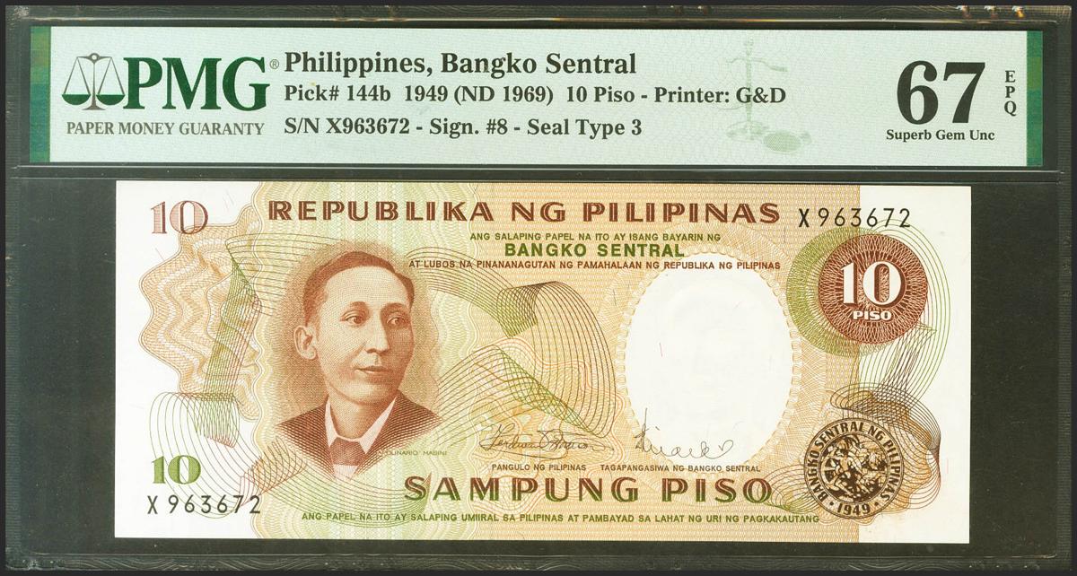 PHILIPPINES. 10 Piso. 1949. (Pick: 144b). PMG67EPQ.
