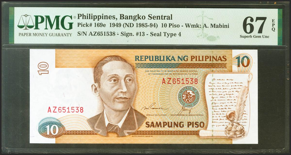 PHILIPPINES. 10 Piso. 1949. (Pick: 169e). PMG67EPQ.