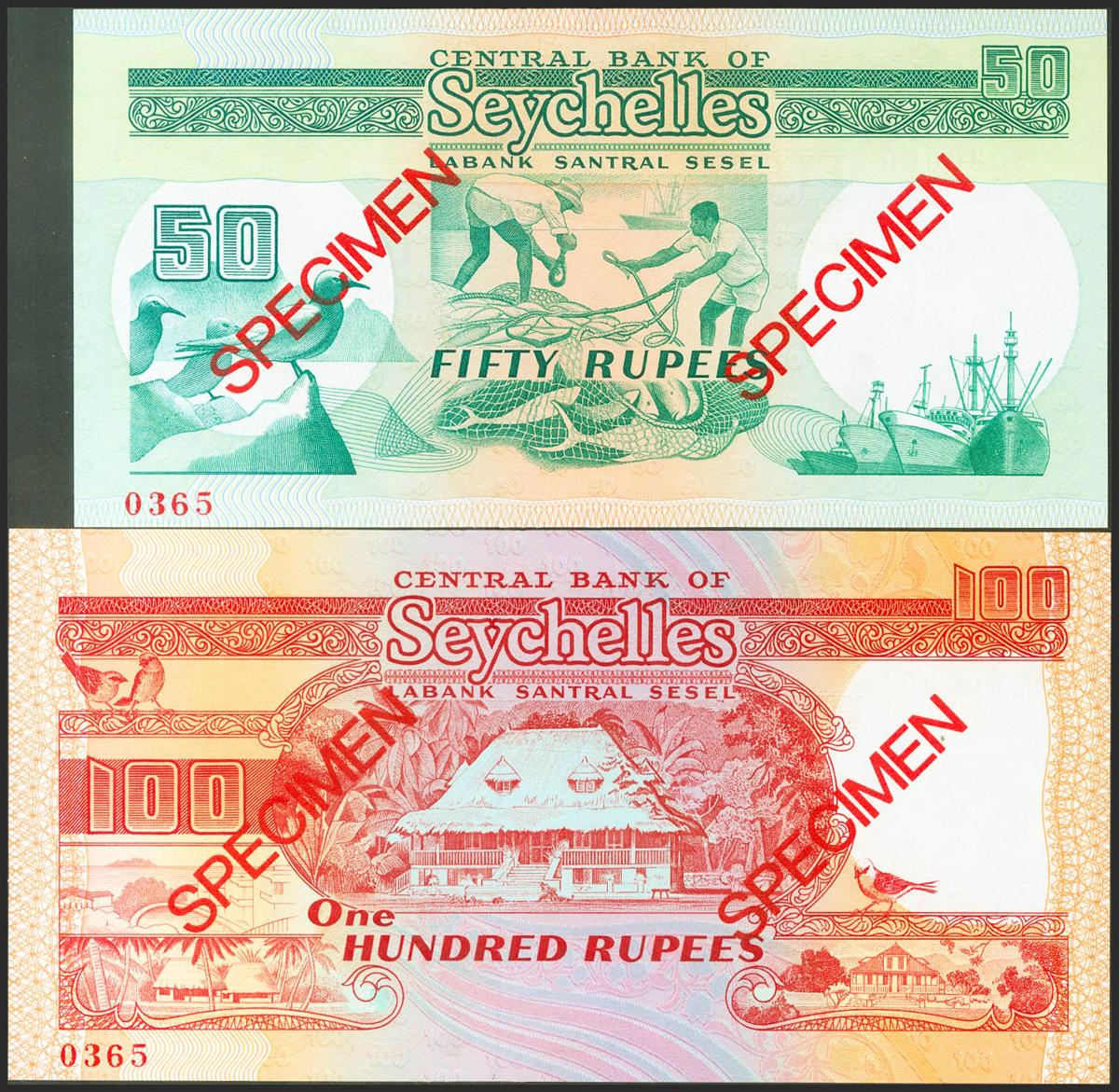 SEYCHELLES. 50 Rupees and 100 Rupees. (1989ca). SPECIMEN. (Pick: 34, 35). Uncirculated.