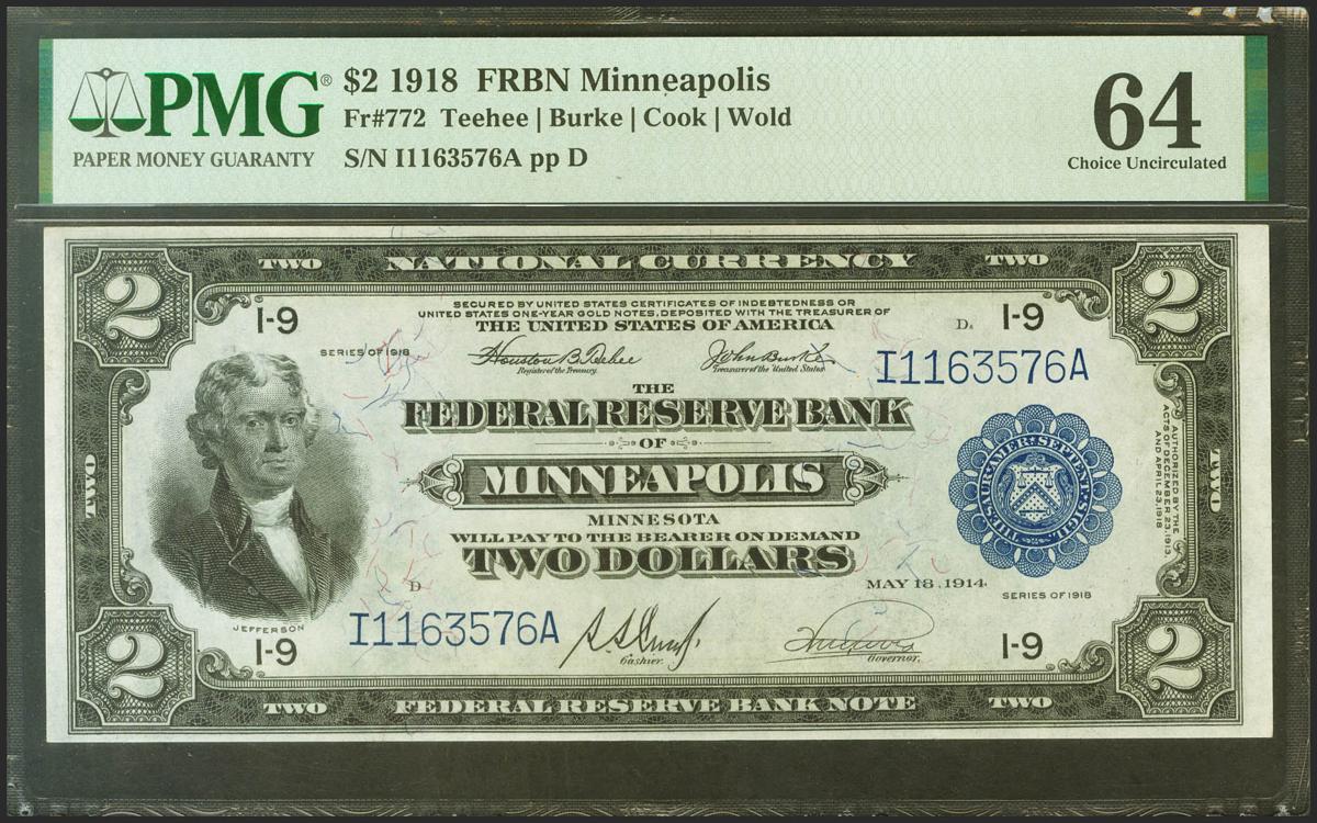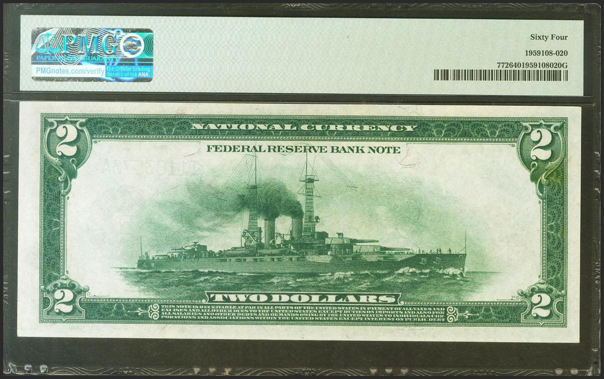 USA. 2 Dollar. National Currency. Serial number I-A. 1914. (Friedberg: 772). Uncirculated. PMG64. (to give an idea of the rarity, Stack´s Bowers auctioned a similar, PMG65EPQ and it sold for $3,120).