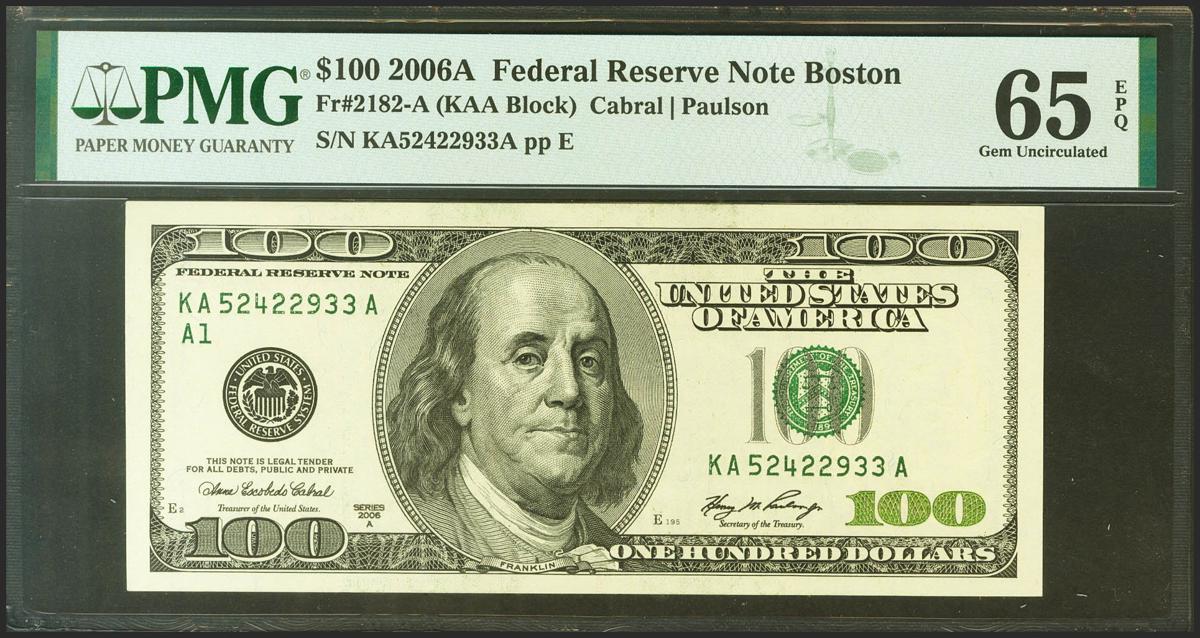 UNITED STATES OF AMERICA. 100 Dollars. 2006A. Serie KA. Federal Reserve Note. (Friedberg: 2182-A). Uncirculated. PMG65EPQ.