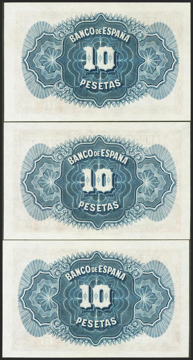 Conjunto de 3 billetes de 10 Pesetas Certificado de Plata emitidos en 1935 con la serie C (Edifil 2021: 364a), conservando su apresto original. SC.