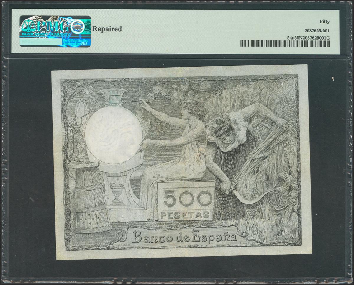500 Pesetas. 1 de Octubre de 1903. Sin serie. (Edifil 2017: 311). Extraordinariamente raro ejemplar, sin duda alguna se trata del billete más raro de todo el siglo XX, para hacernos una idea de su rareza desde el año 2015 sólamente 6 ejemplares han sido ofrecidos en pública subasta, profesionalmente restaurado. EBC. Encapsulado PMG50NET. (para poder contextualizar su grado de rareza-calidad indicar que a día 15 de Junio de 2021, sólo existe otro billete graduado en PMG con grado 30).