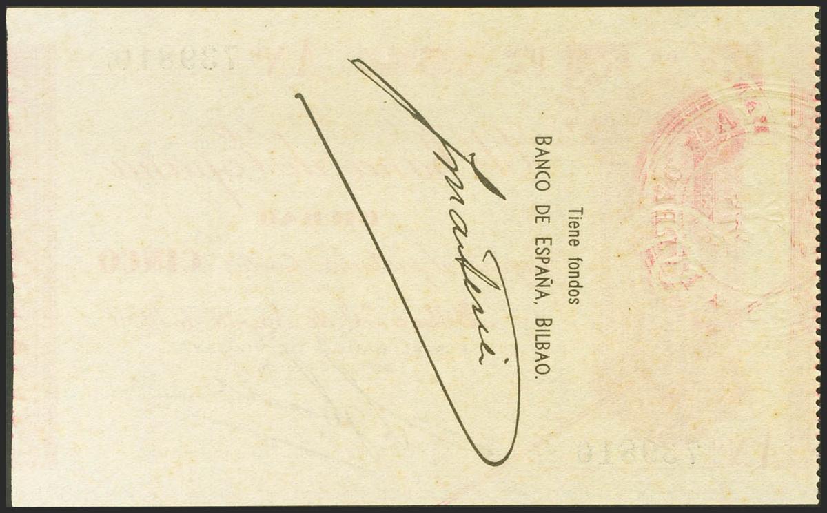 5 Pesetas. 30 de Agosto de 1936. Sucursal de Bilbao, antefirma del Banco de Vizcaya. Serie A. (Edifil 2021: 368Aa). Inusual, ligerísima ondulación que de ninguna manera rompe la fibra. EBC++.
