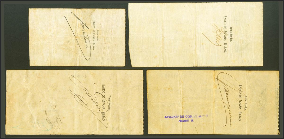 Serie completa de 4 billetes de 5 Pesetas, 25 Pesetas, 50 Pesetas y 100 Pesetas, sin incluir el 5 Pesetas con la serie A, emitidos a partir del 30 de Agosto de 1936 por el Banco de España en Bilbao (Edifil 2017: 368/71). MBC+/BC+.