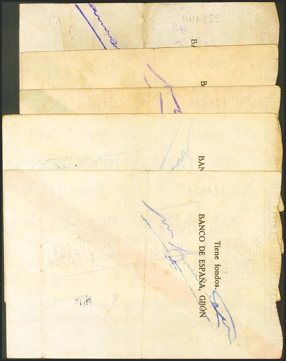 Conjunto de 5 billetes de 5 Pesetas, 10 Pesetas, 25 Pesetas, 50 Pesetas y 100 Pesetas emitidos por la sucursal de Gijón el 5 de Noviembre de 1936. (Edifil 2021: 380/84). Conjunto de enorme calidad, recordamos que estos billetes muy raramente se encuentran en calidades altas. EBC-/MBC+.