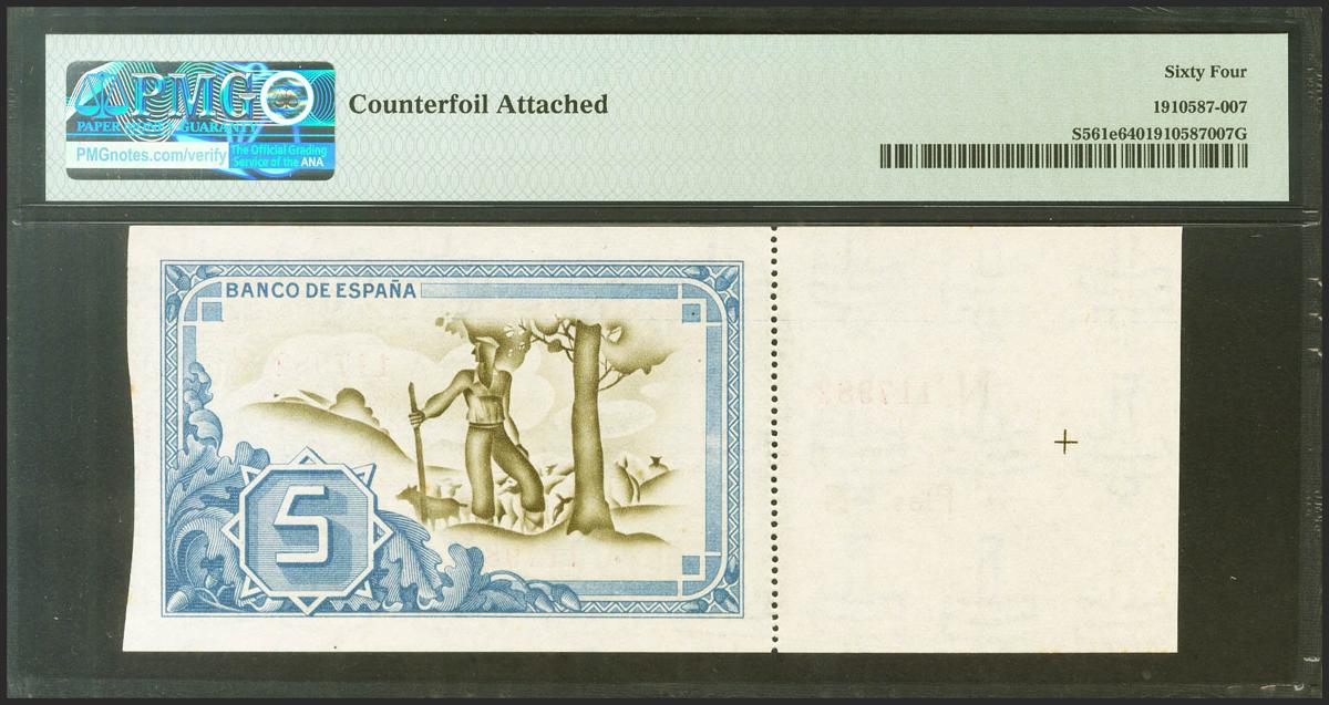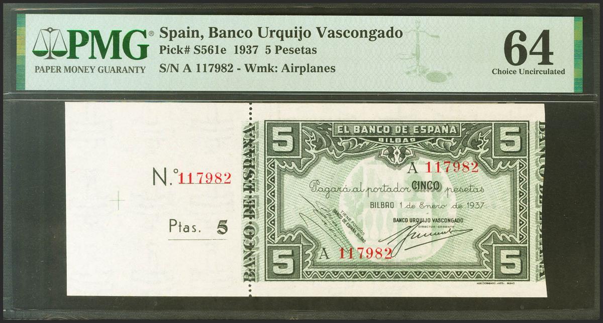 5 Pesetas. 1 de Enero de 1937. Serie A y antefirma Banco Urquijo Vascongado, matriz a la izquierda. (Edifil 2021: 386f, Pick: S561e). SC. Encapsulado PMG4.