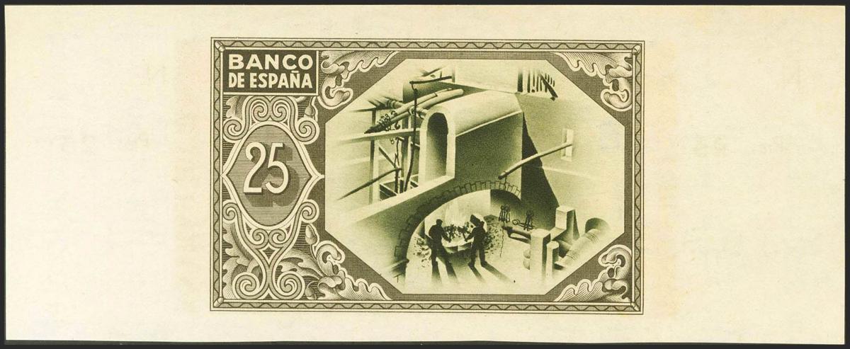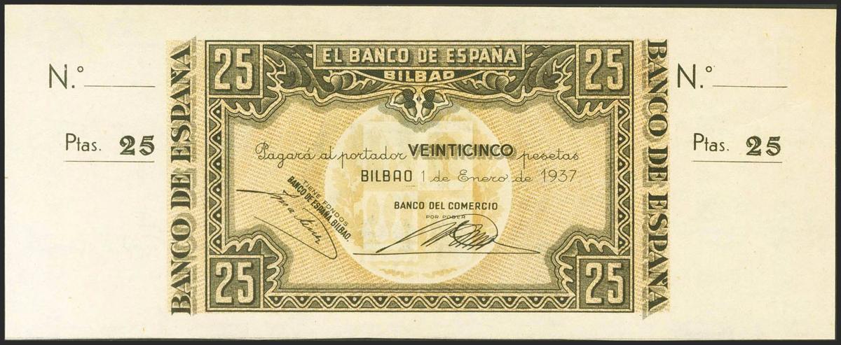 25 Pesetas. 1 de Enero de 1937. Sucursal de Bilbao, antefirma Banco del Comercio. Sin serie y sin numeración, con ambas matrices. (Edifil 2017: 388b). Apresto original. SC.