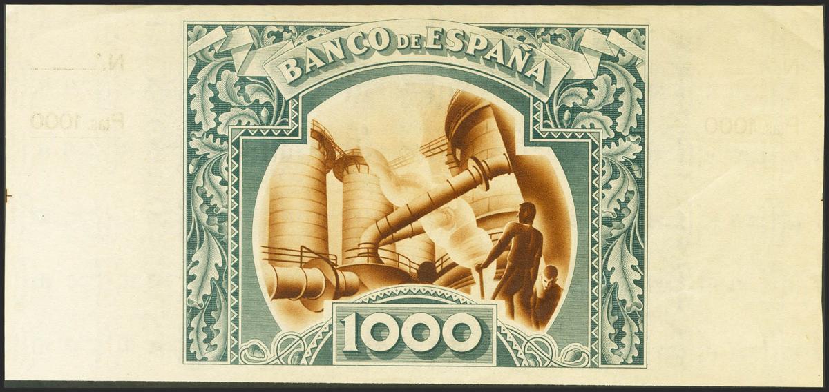 1000 Pesetas. 1 de Enero de 1937. Sucursal de Bilbao, antefirma Banco de Vizcaya. Sin serie y sin numeración, con ambas matrices. (Edifil 2021: NE27g). Presenta gran parte de su apresto original. EBC+.