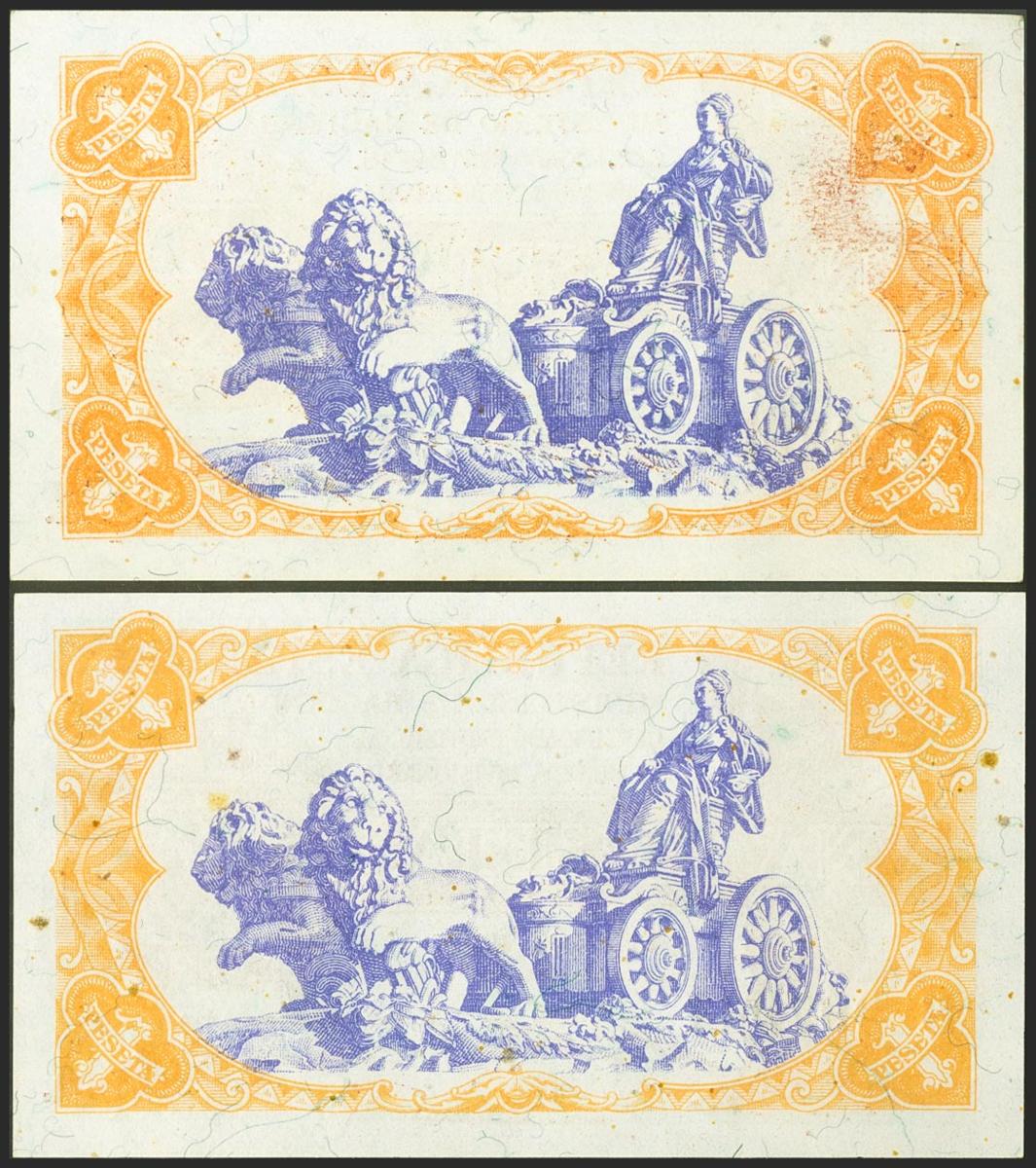 Conjunto de 2 billetes de 1 Peseta Ministerio de Hacienda emitido en 1937 con las series A y B, respectivamente (Edifil 2021: 392). Típicos puntitos y apresto original. SC/SC-.