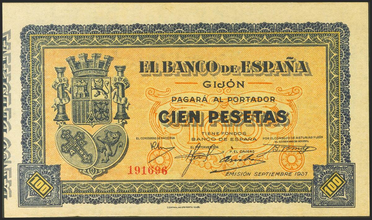 100 Pesetas. Septiembre 1937. Asturias y León. Sin serie. (Edifil 2021: 399). Apresto original. EBC+.