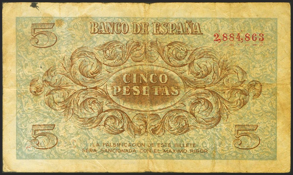 5 Pesetas. 21 de Noviembre de 1936. Sin serie. (Edifil 2021: 417). Inusual, machita de tinta, sin reparaciones. MBC-.