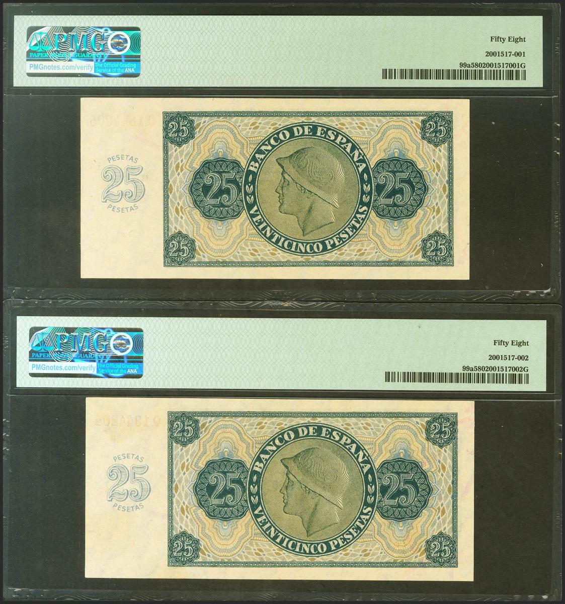 25 Pesetas. 21 de Noviembre de 1936. Pareja correlativa. Serie Q. (Edifil 2021: 419a, Pick: 99a). Apresto original. EBC++. Encapsulados PMG58, ambos.