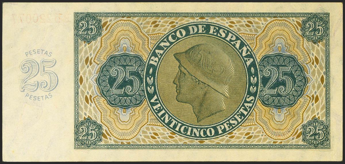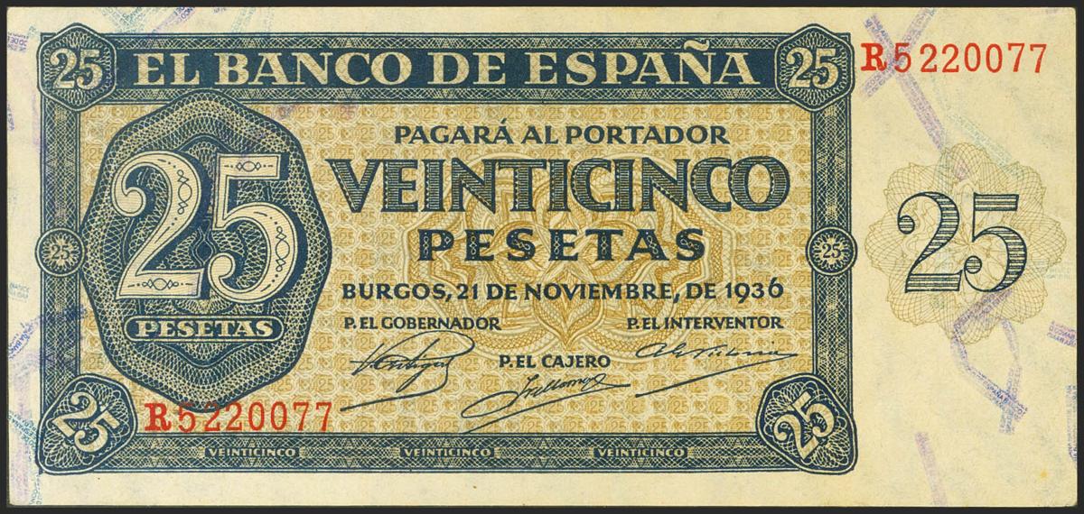 25 Pesetas. 21 de Noviembre de 1936. Serie R. (Edifil 2021: 419a). Conserva todo su apresto original. SC-.