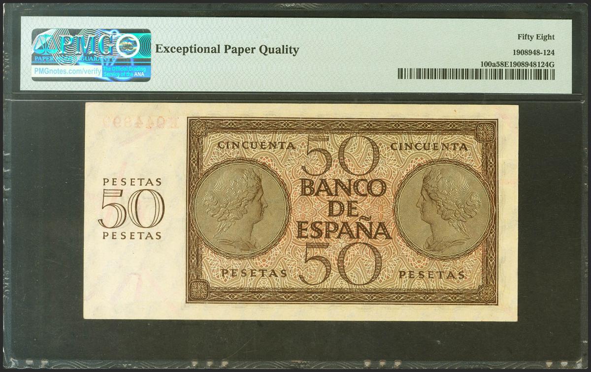 50 Pesetas. 21 de Noviembre de 1936. Serie K. (Edifil 2021: 420a, Pick: 100a). Apresto original. EBC+++. Encapsulado PMG58EPQ.