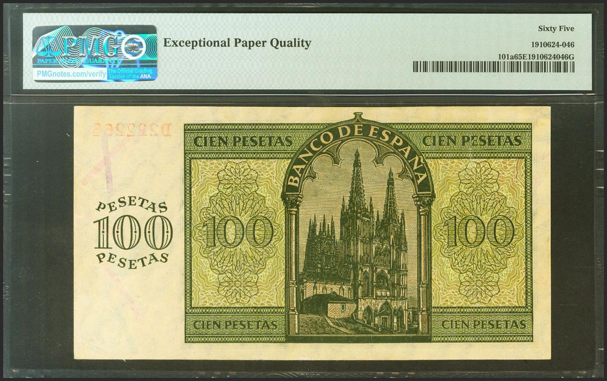 100 Pesetas. 21 de Noviembre de 1936. Serie D. (Edifil 2021: 421a, Pick: 101a). Inusual en esta excepcional calidad, apresto original. SC. Encapsulado PMG65EPQ.