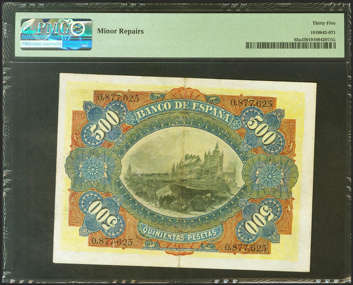 500 Pesetas. 15 de Julio de 1907. Sin serie. (Edifil 2021: 321, Pick: 65a). Mínimamente reparado. EBC. Encapsulado PMG35.