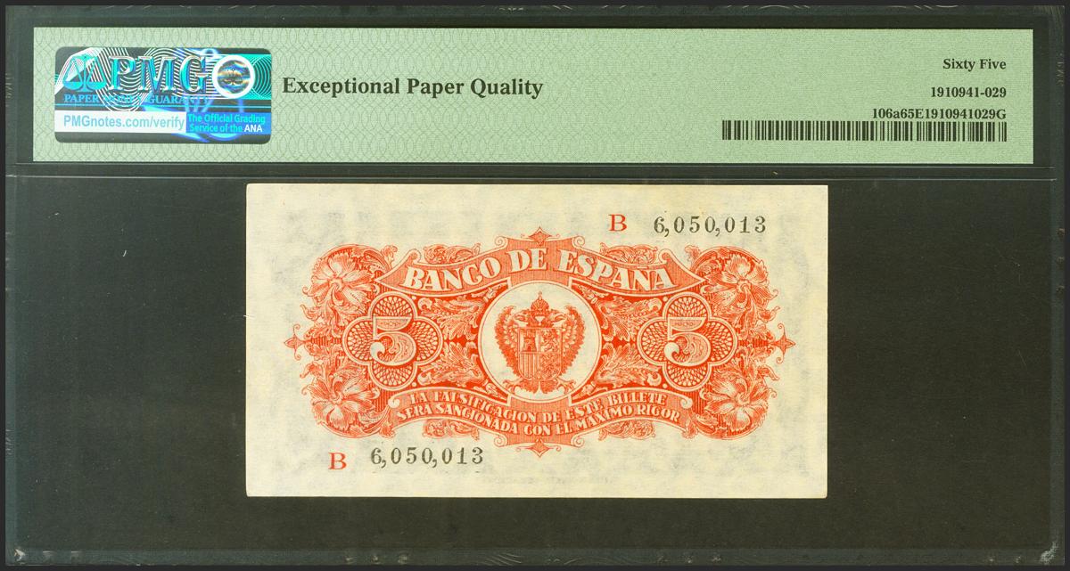 5 Pesetas. 18 de Julio de 1937. Serie B. (Edifil 2021: 424a, Pick: 106a). Inusual en esta calidad, apresto original. SC. Encapsulado PMG65EPQ.