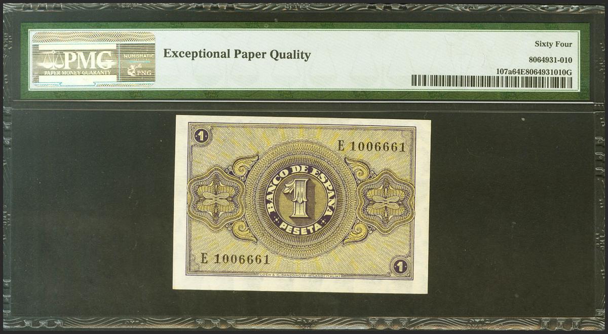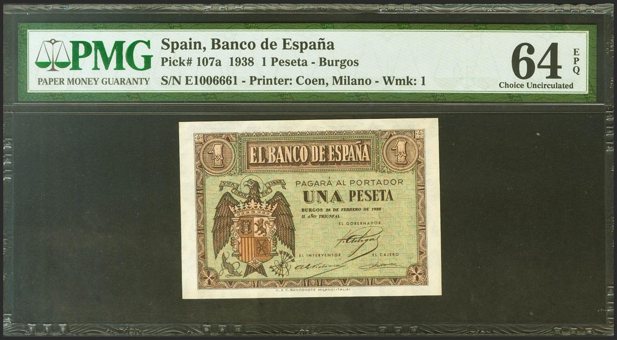 1 Peseta. 28 de Febrero de 1938. Serie E. (Edifil 2021:427a, Pick: 107a). Apresto original. SC. Encapsulado PMG64EPQ.