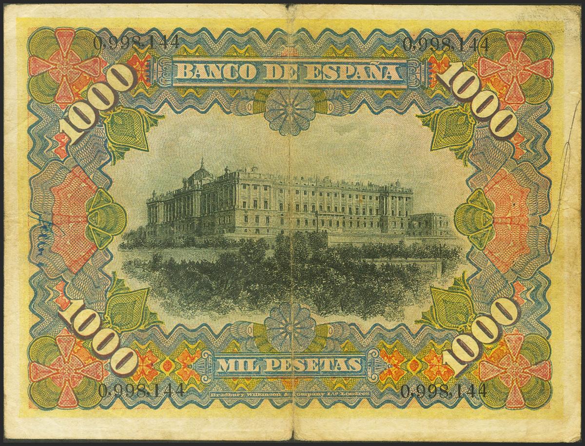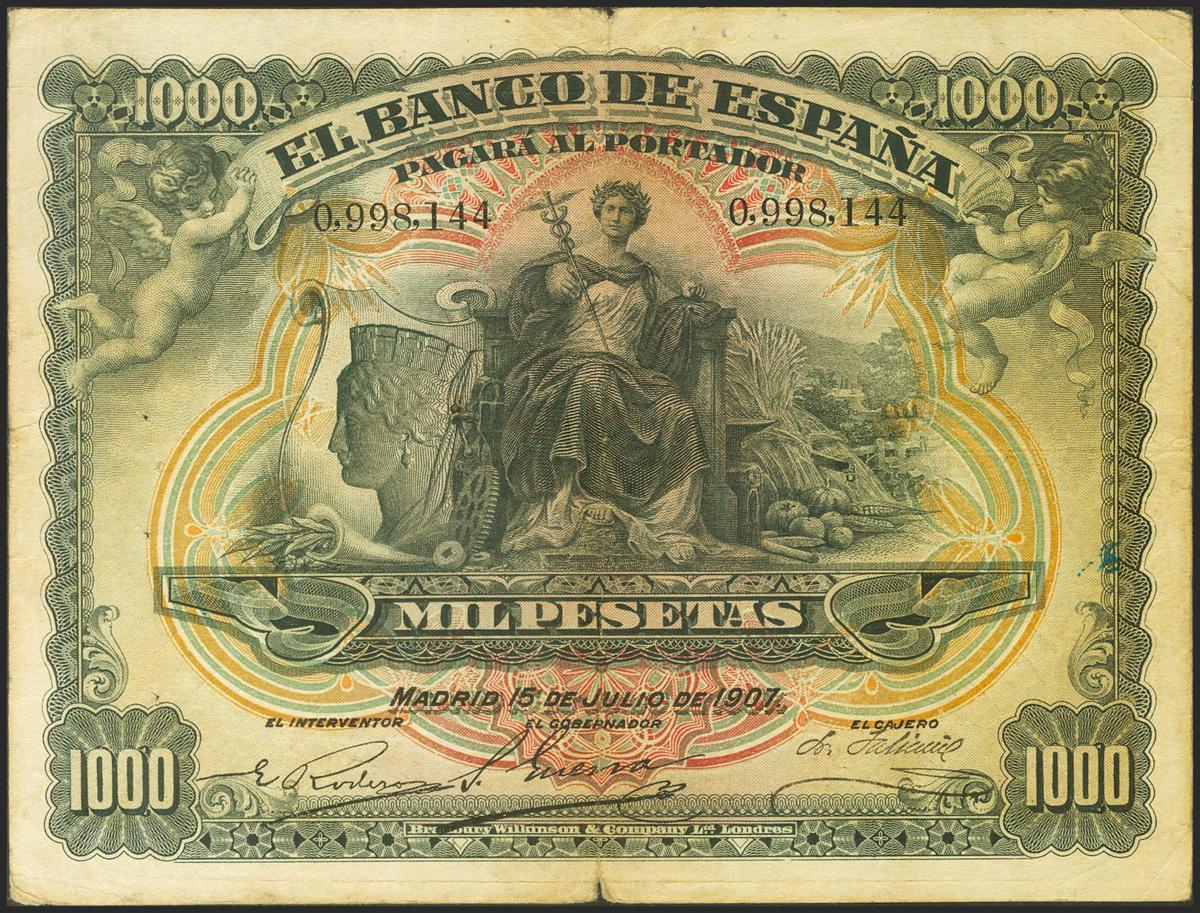 1000 Pesetas. 15 de Julio de 1907. Sin serie. (Edifil 2021: 322). Inusual y con puntitos de aguja, billete sin reparaciones. MBC.