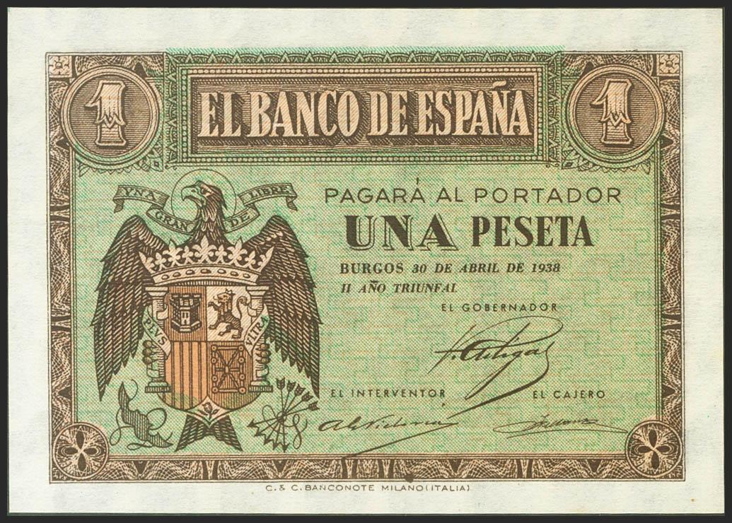1 Peseta. 30 de Abril de 1938. Serie A. (Edifil 2021: 428). Apresto original. SC.