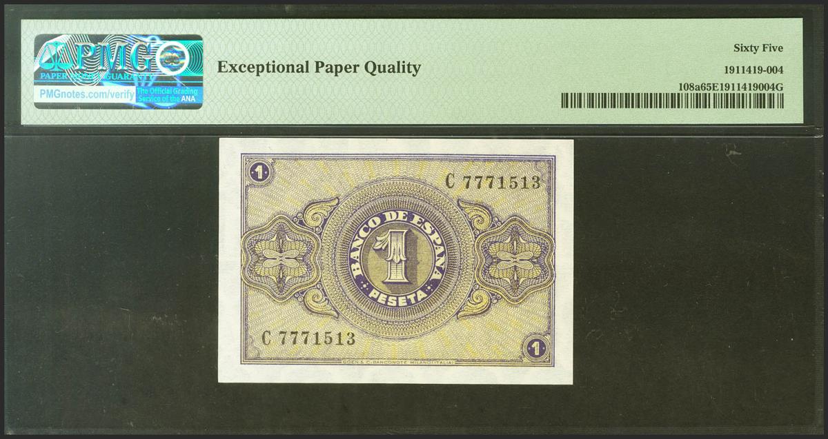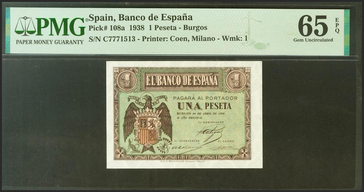 1 Peseta. 30 de Abril de 1938. Serie C. (Edifil 2021: 428a, Pick: 108a). Apresto original. SC. Encapsulado PMG65EPQ.