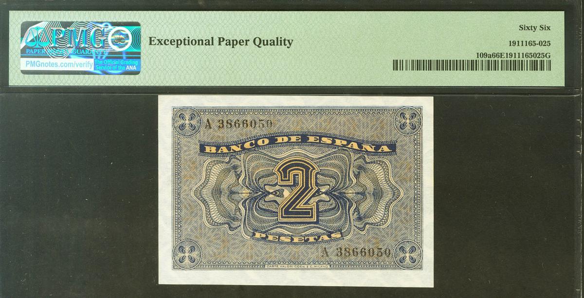 2 Pesetas. 30 de Abril de 1938. Serie A. (Edifil 2021: 429, Pick: 109a). Raro en esta excepcional calidad, apresto original. SC. Encapsulado PMG66EPQ.