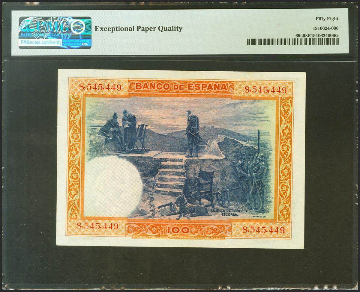 100 Pesetas. 1 de Julio de 1925. Sin serie. (Edifil 2021: 323, Pick: 69a). Muy raro en esta excepcional calidad, apresto original. EBC+++. Encapsulado PMG58EPQ.