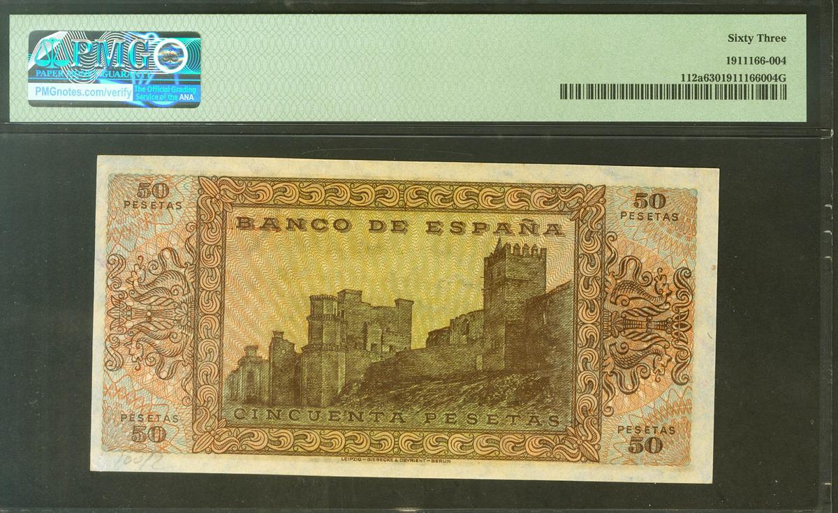 50 Pesetas. 20 de Mayo de 1938. Serie E, última serie emitida. (Edifil 2021: 431a, Pick: 112a). Inusual. SC. Encapsulado PMG63.