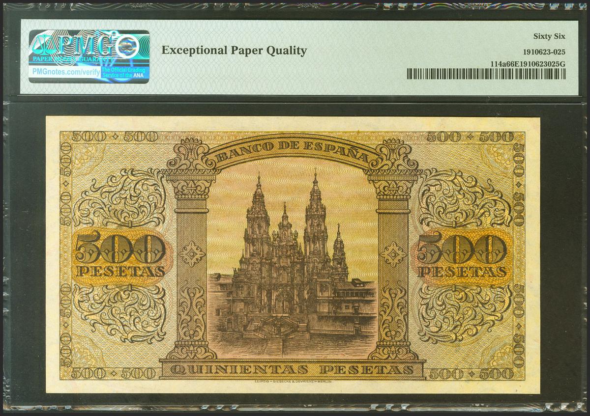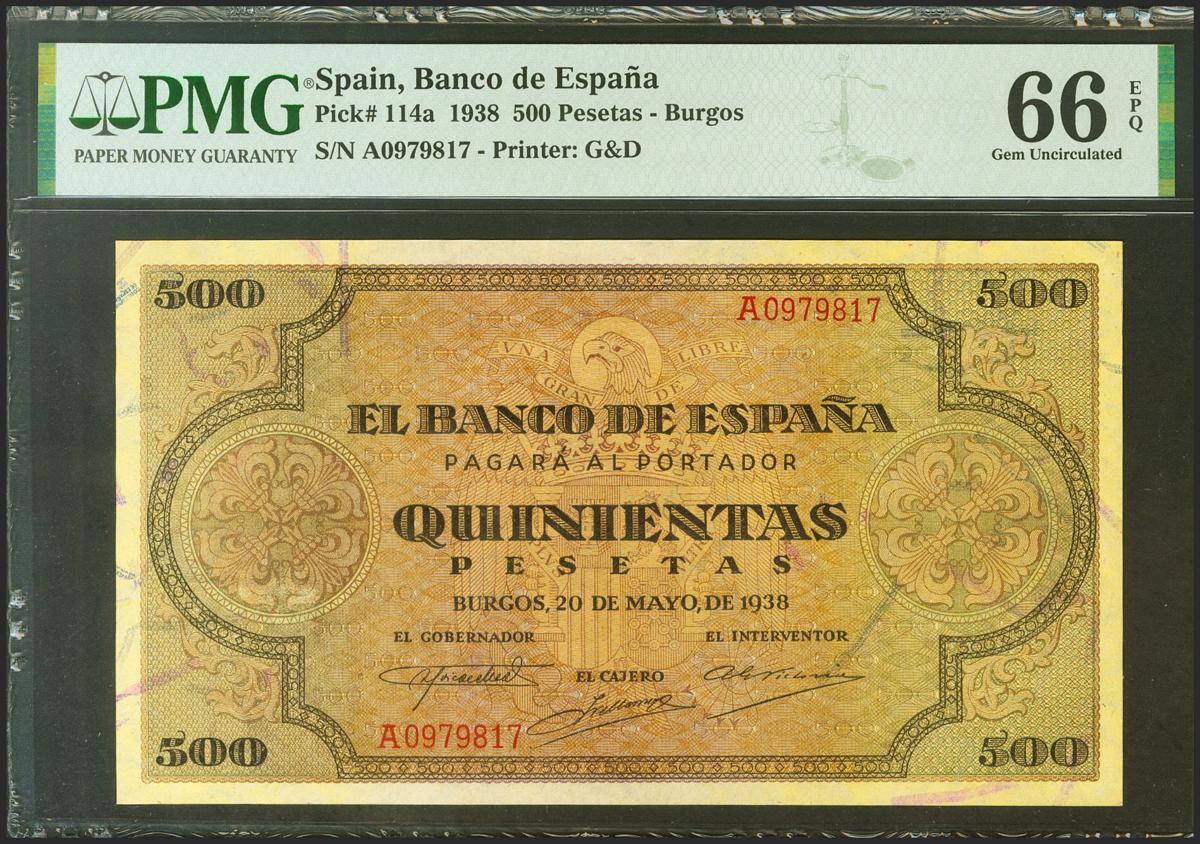 500 Pesetas. 20 de Mayo de 1938. Serie A. (Edifil 2021: 433, Pick: 114a). Rarísimo en esta excepcional calidad, apresto original. SC. Encapsulado PMG66EPQ. (Para hacernos una idea de la rareza de este billete, a fecha 1 de Julio de 2022, es el tercer mejor calificado junto a otros once billetes en PMG)