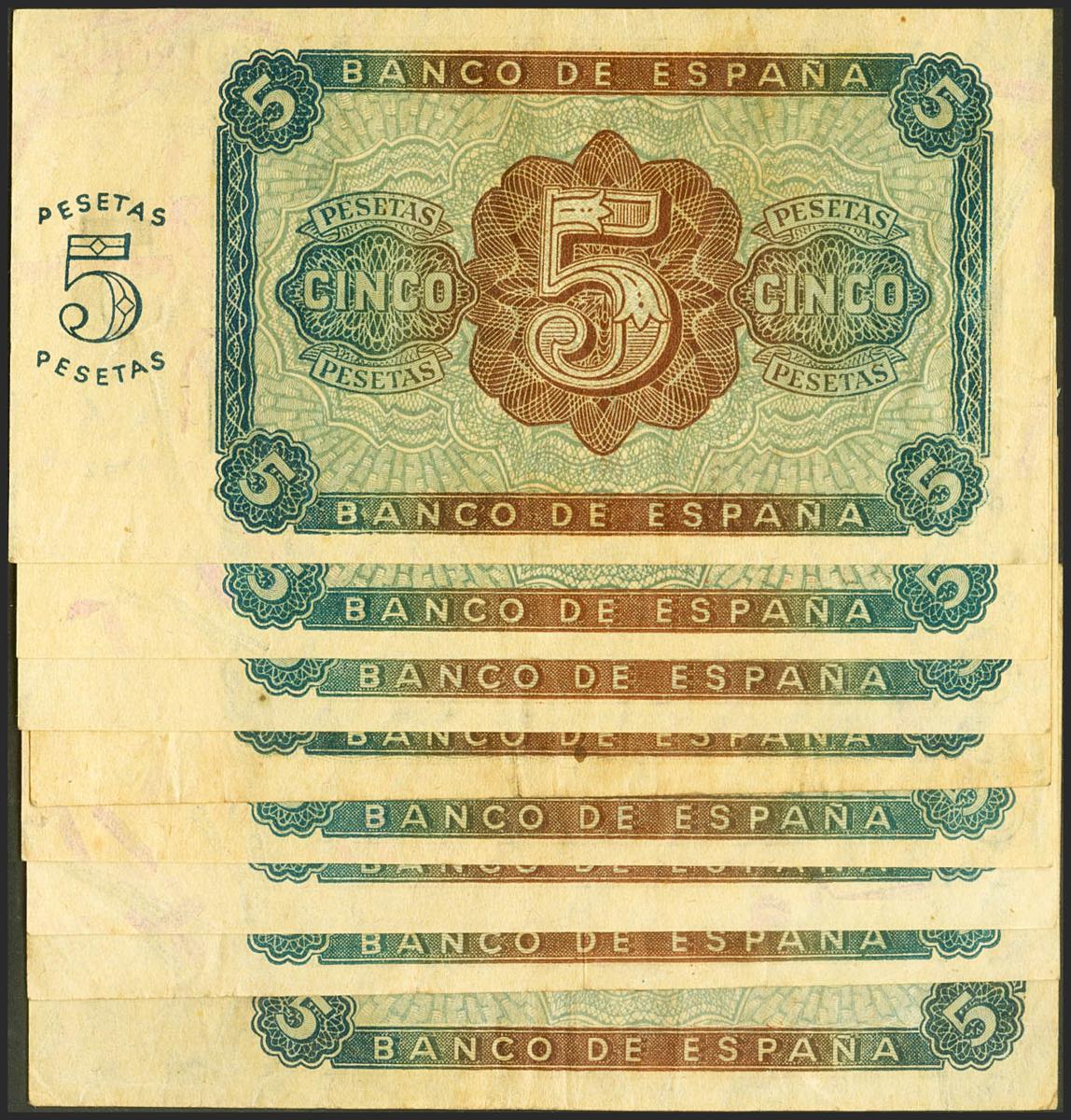 Conjunto de 8 billetes de 5 Pesetas emitidos el 10 de Agosto 1938, con la serie A(1), J(6) y K(1)(Edifil 2021: 435, 435a), conservando gran parte de su apresto original. EBC-/EBC.