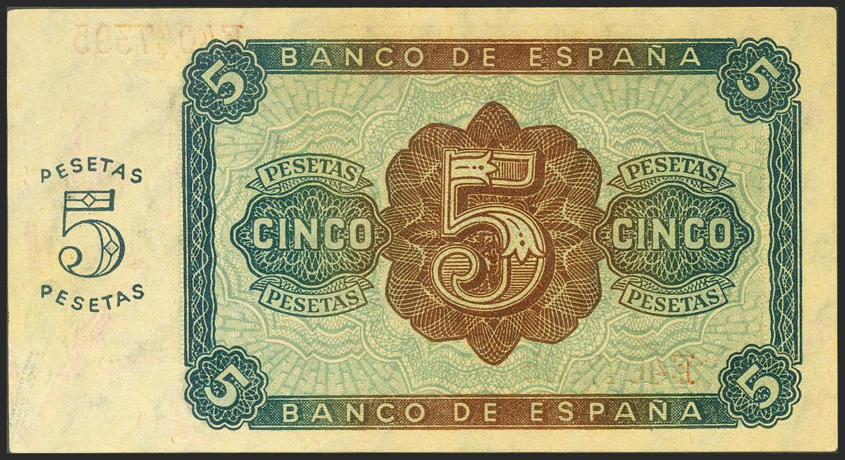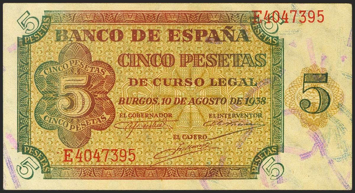 5 Pesetas. 10 de Agosto de 1938. Serie E. (Edifil 2021: 435a). Apresto original. SC-.