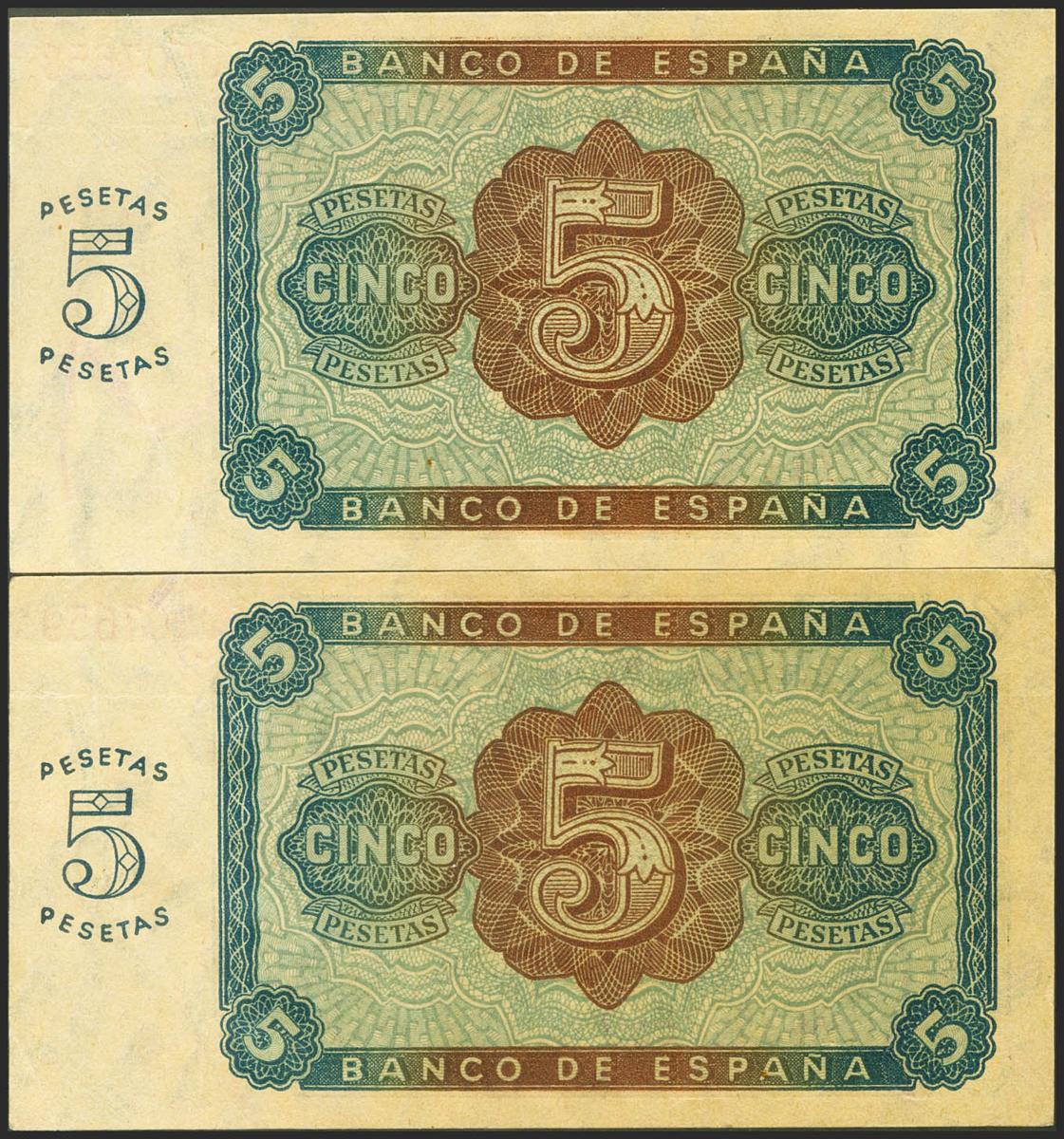 5 Pesetas. 10 de Agosto de 1938. Pareja correlaiva. Serie M, última serie emitida. (Edifil 2021: 435b). Rarísimo, conserva todo su apresto original. EBC+.