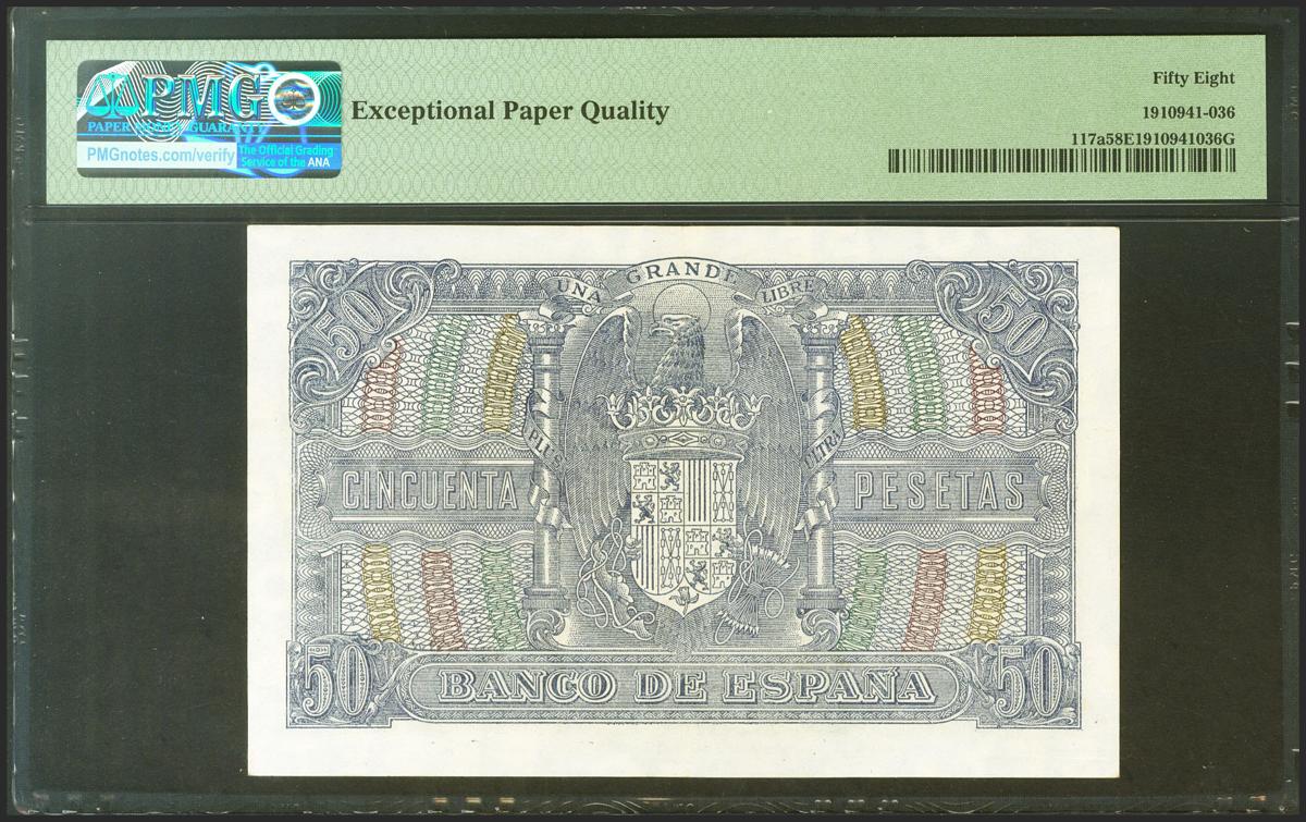50 Pesetas. 9 de Enero de 1940. Serie E, última serie emitida. (Edifil 2021: 437a, Pick: 117a). Apresto original. EBC+++. Encapsulado PMG58EPQ.