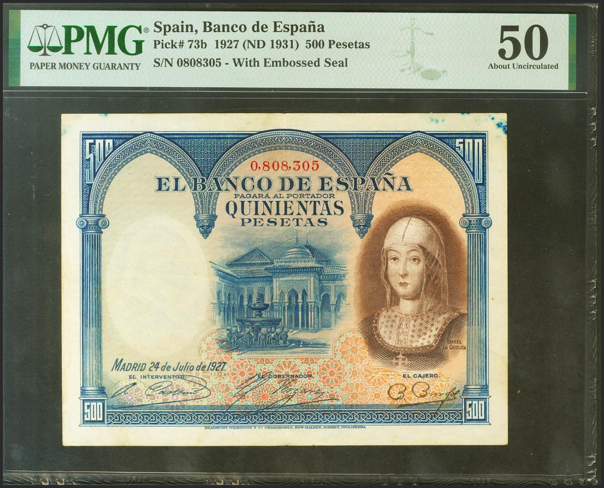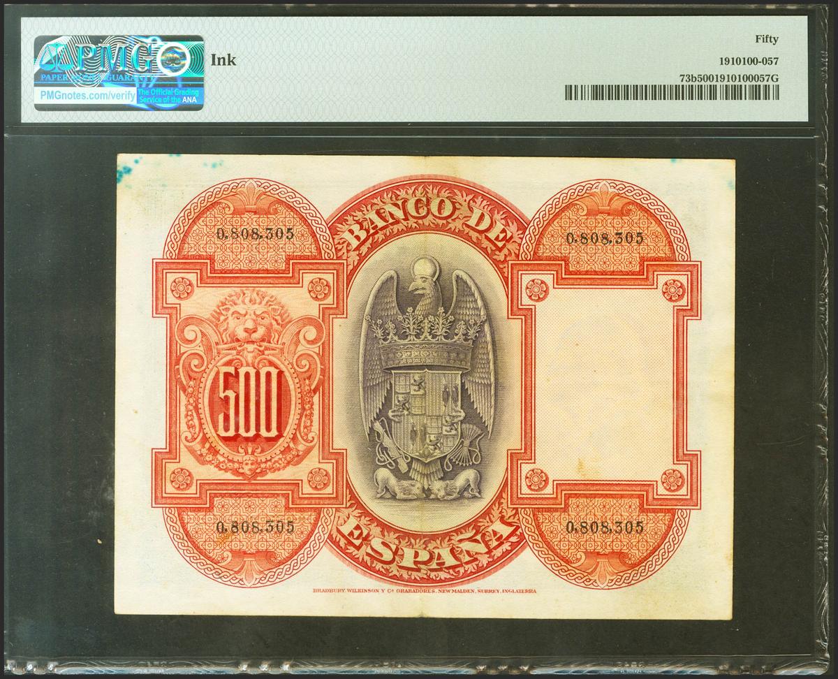 500 Pesetas. 24 de Julio de 1927. Sin serie y numeración anterior al 1602000. (Edifil 2021: 327, Pick: 73b). Muy raro, manchitas de tinta. EBC. Encapsulado PMG50.