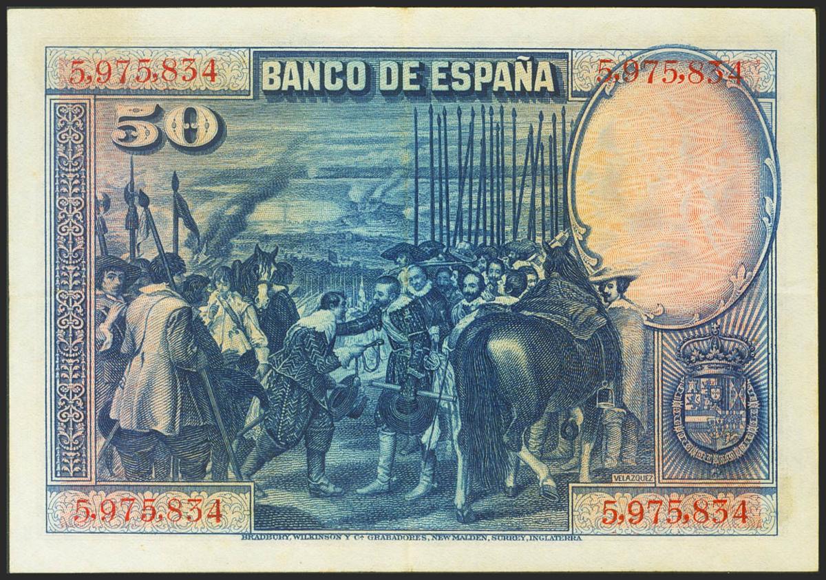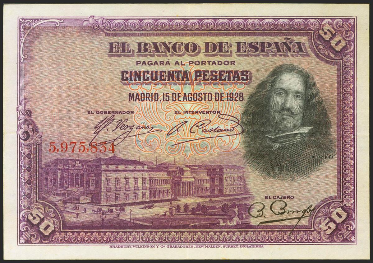 50 Pesetas. 15 de Agosto de 1928. Sin serie. (Edifil 2021: 329). Conserva algo de apresto original. MBC+.