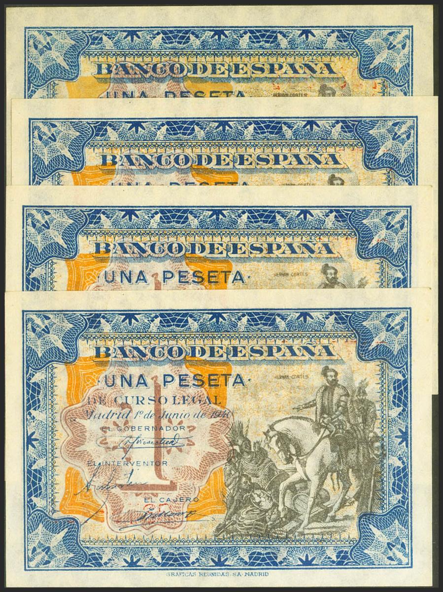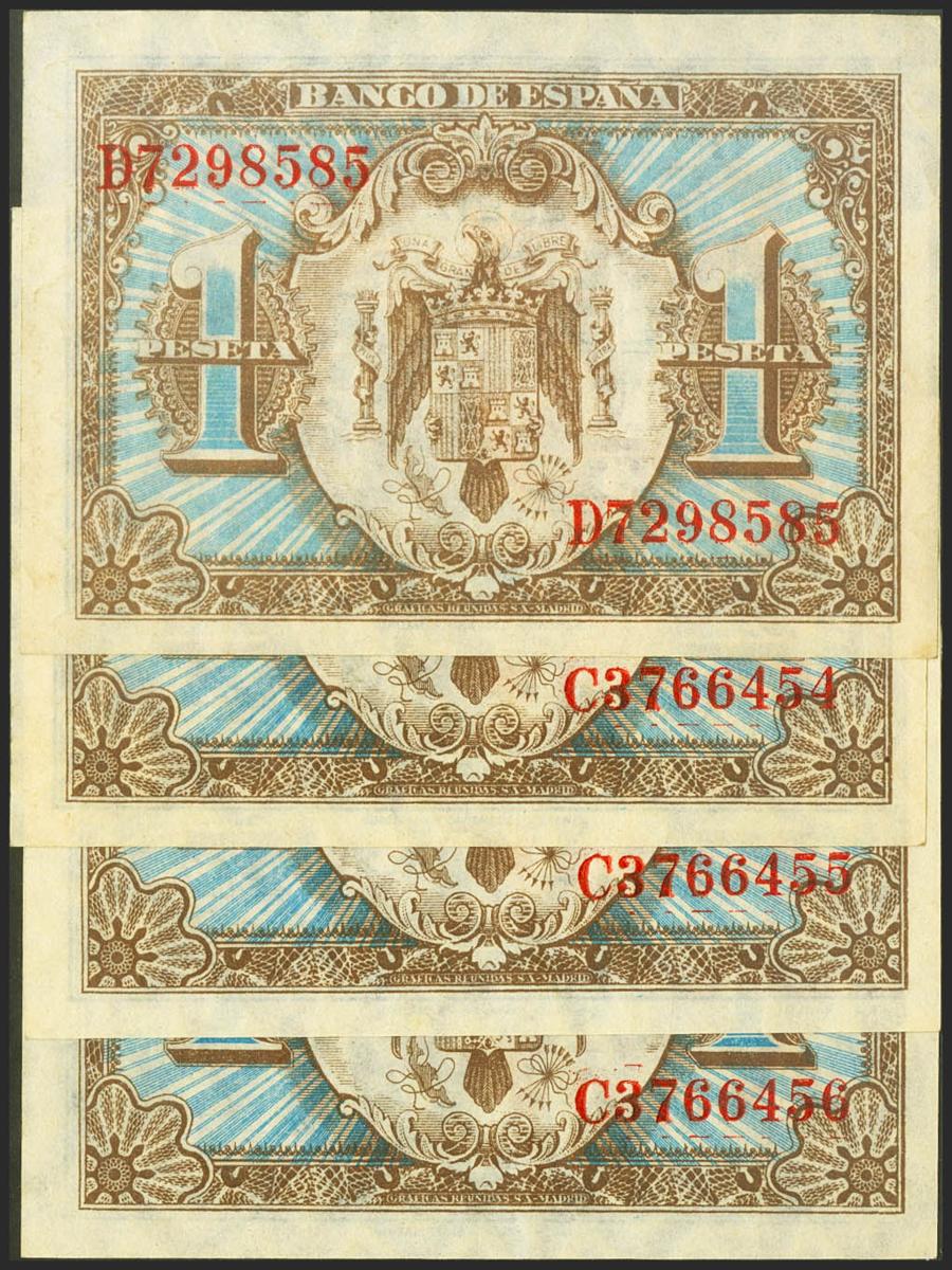 Conjunto de 4 billetes de 1 Peseta emitidos el 1 de Junio de 1940 con la serie C y todos ellos correlativos excepto uno con la serie D. (Edifil 2021: 441a), conservando gran parte del apresto original. EBC+/EBC.