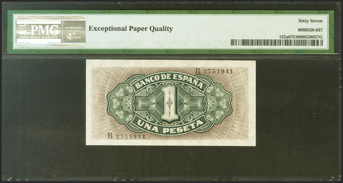 1 Peseta. 4 de Septiembre de 1940. Sin serie. (Edifil 2021: 442, Pick: 122a). Raro en esta excepcional calidad, apresto original. SC. Encapsulado PMG67EPQ.