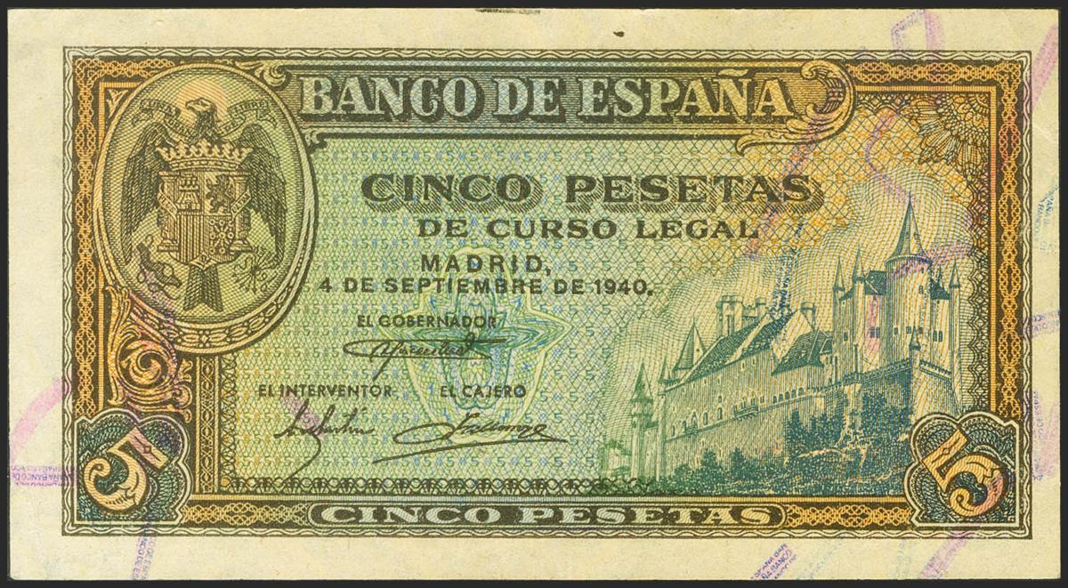 5 Pesetas. 4 de Septiembre de 1940. Serie D. (Edifil 2021: 443a). Conserva parte del apresto. EBC.
