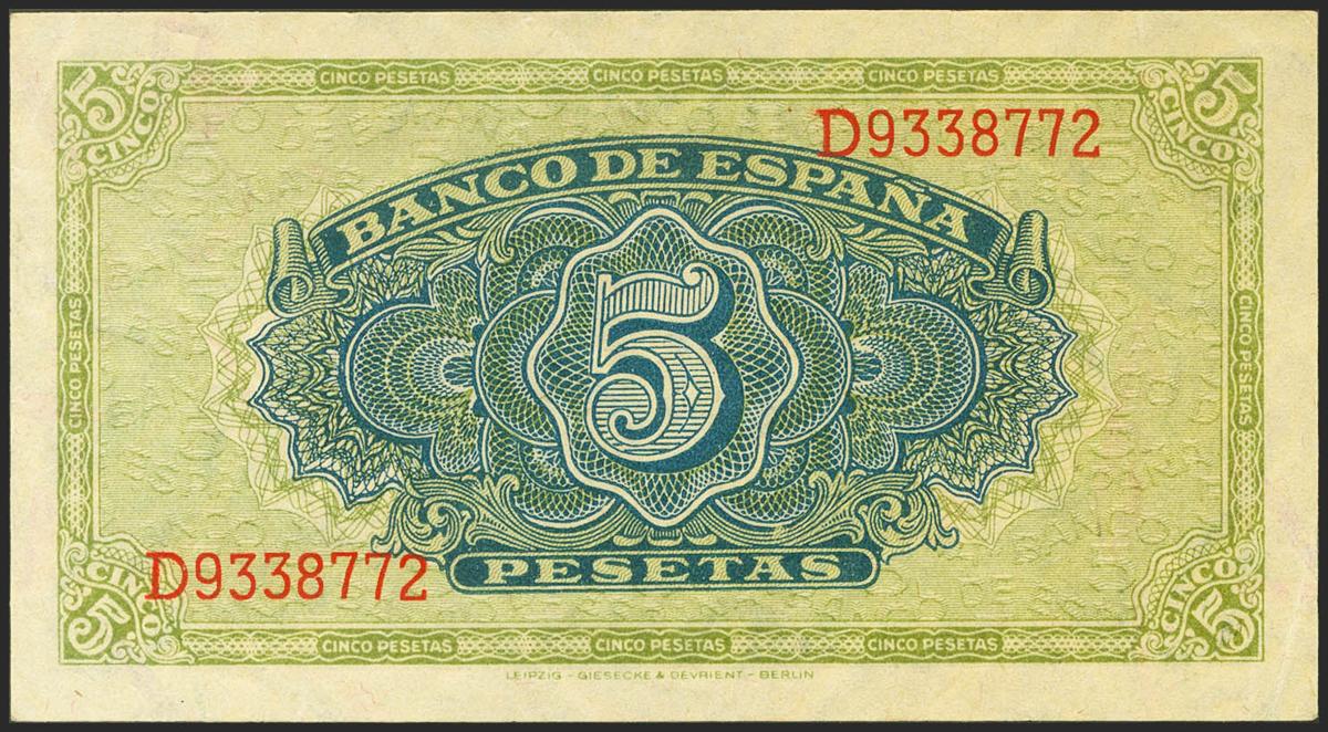 5 Pesetas. 4 de Septiembre de 1940. Serie D. (Edifil 2021: 443a). Conserva parte del apresto. EBC.