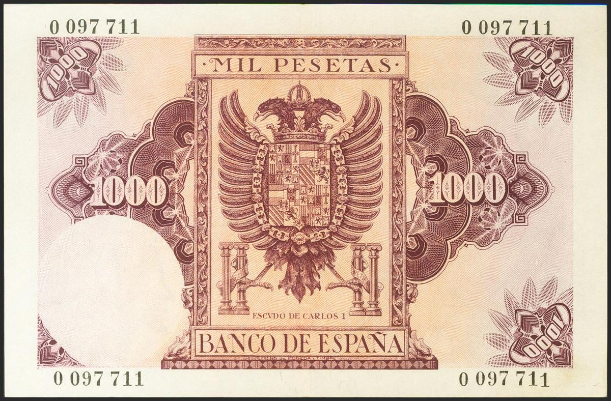 1000 Pesetas. 21 de Octubre de 1940. Sin serie y con numeración baja. (Edifil 2021: 445, Pick: 125a). Muy raro en esta calidad, conservando gran parte de su apresto original. EBC.