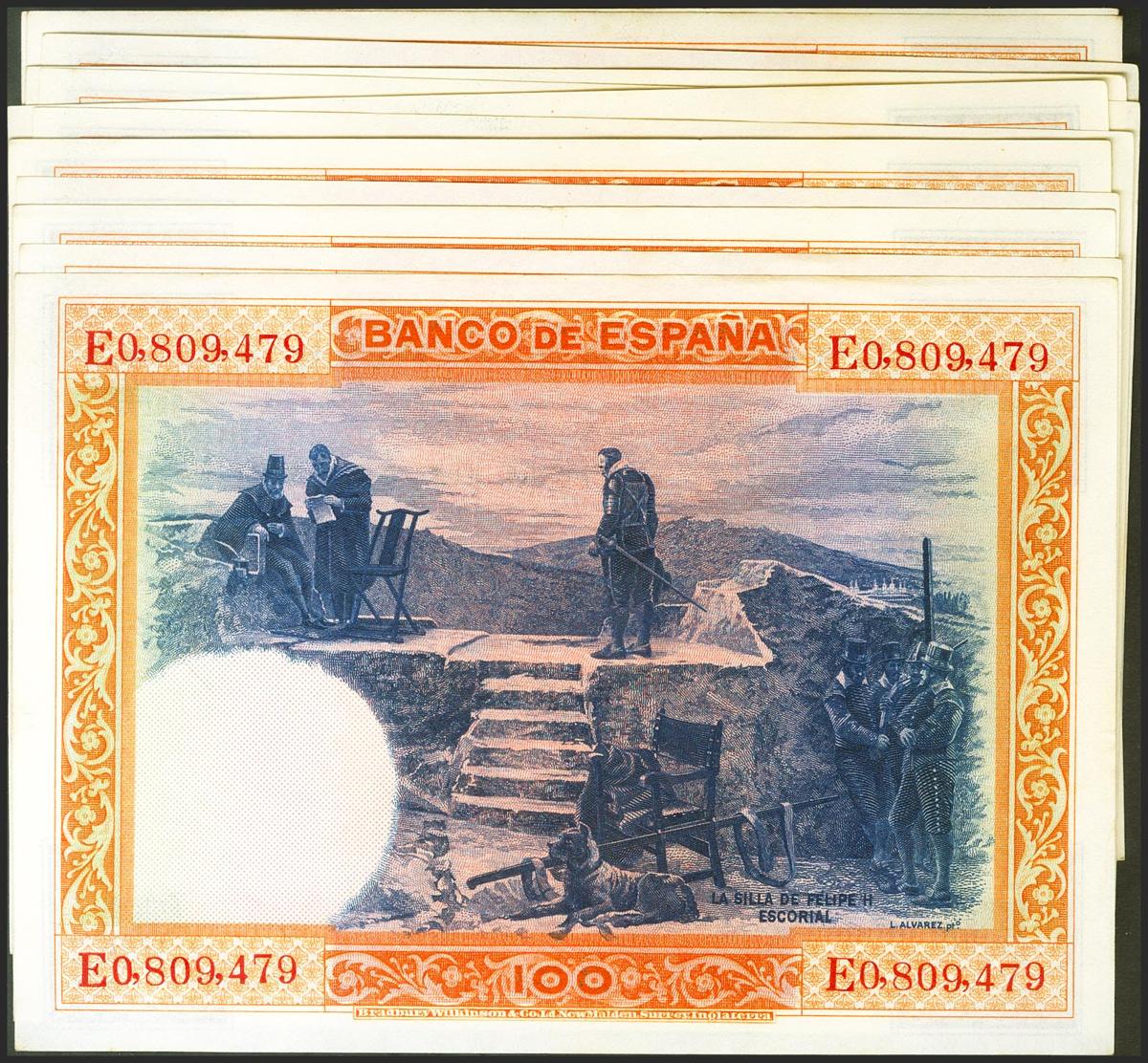 Conjunto de 20 billetes en tramos correlativos de 100 Pesetas emitidos el 1 de Julio de 1925 con la serie E (Edifil 2021: 350), conservando todo su apresto original. EBC+.
