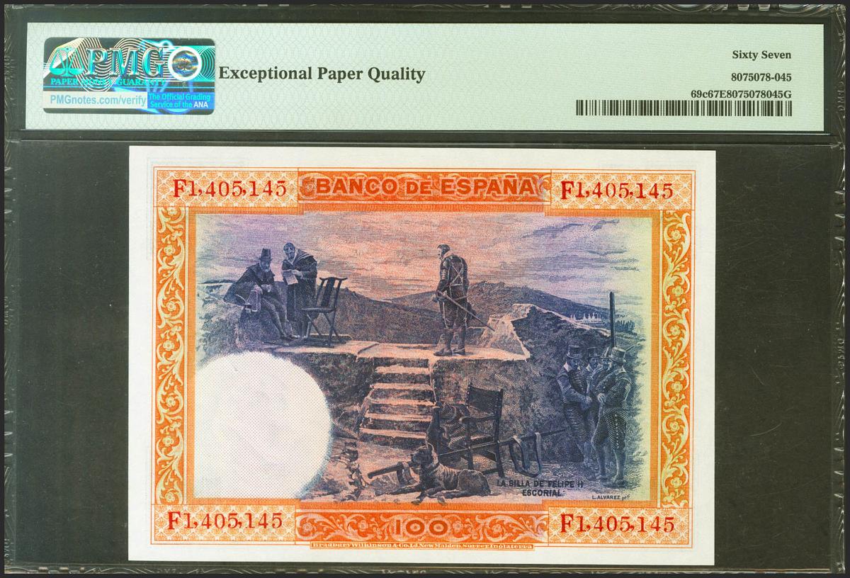 100 Pesetas. 1 de Junio de 1925. Serie F. (Edifil 2021: 350, Pick: 69c). Inusual en esta excepcional calidad, apresto original SC. Encapsulado PMG67EPQ.