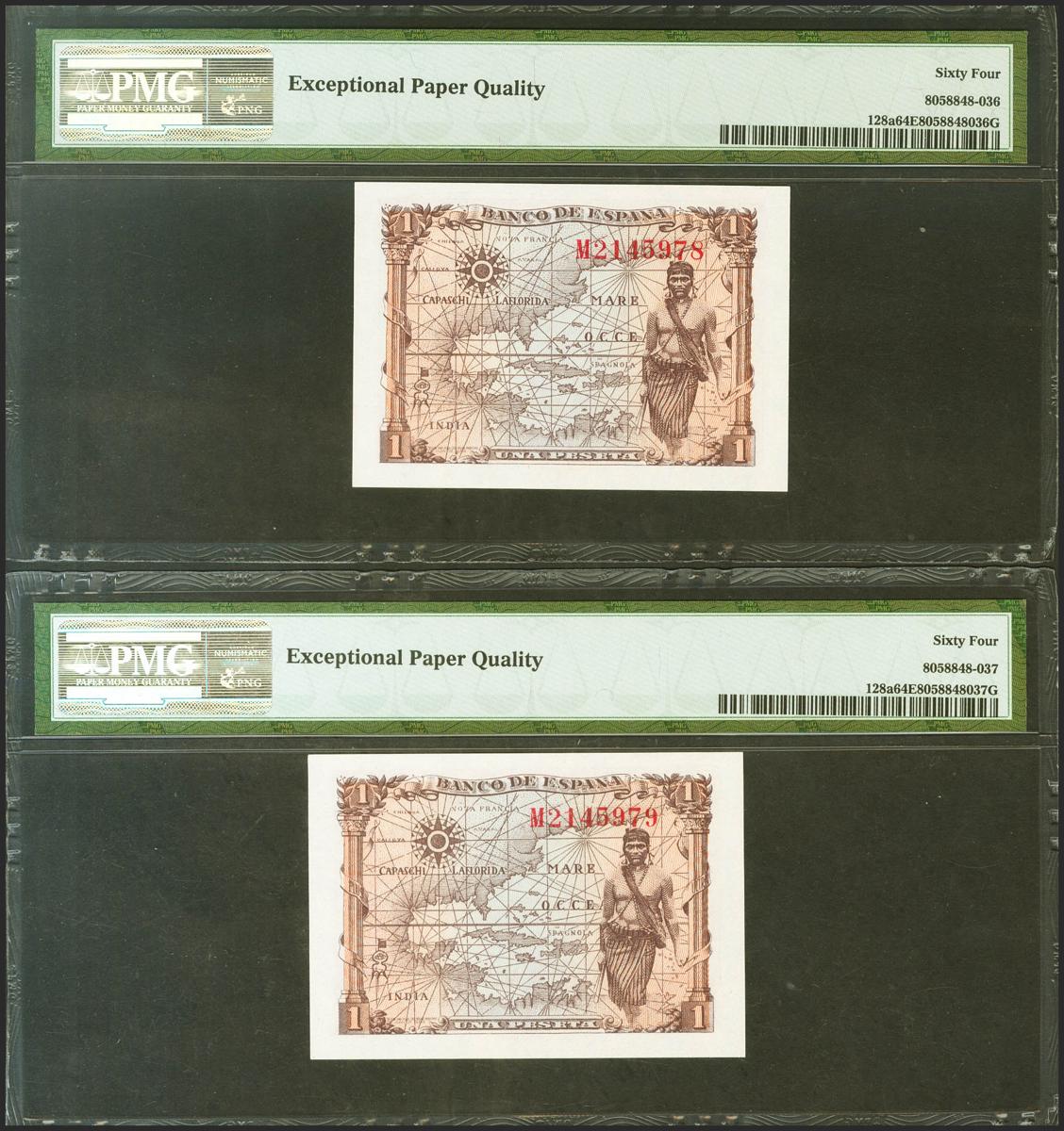1 Peseta. 15 de Junio de 1945. Pareja correlativa. Serie M, última serie emitida. (Edifil 2017: 448a, Pick: 128a). Apresto original. SC. Encapsulado PMG64EPQ.