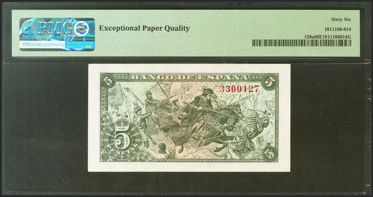 5 Pesetas. 15 de Junio de 1945. Sin serie. (Edifil 2021: 449, Pick: 129a). Raro en esta calidad, apresto original. SC. Encapsulado PMG66EPQ.