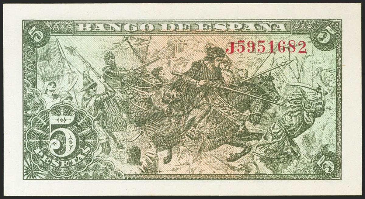 5 Pesetas. 15 de Julio de 1945. Serie J. (Edifil 2021: 449a). Apresto original. SC.